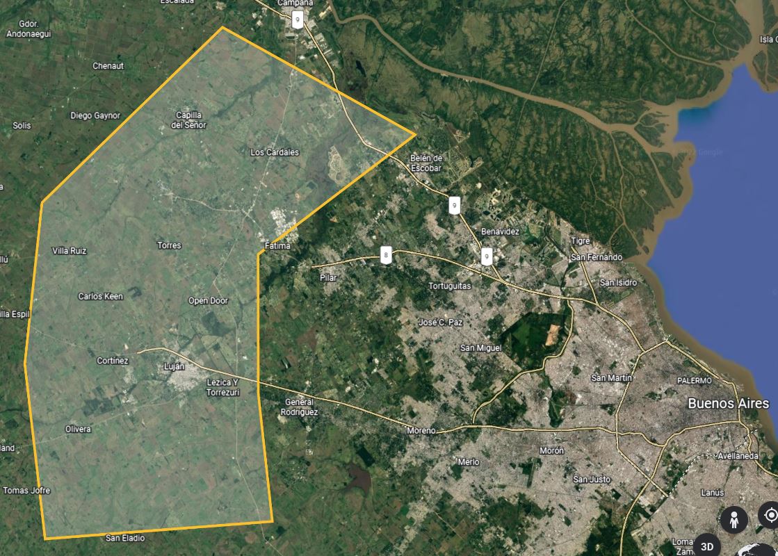 En primera instancia se priorizan localidades como Mercedes o San Andrés de Giles. A continuación se demarca la zona de búsqueda para el emplazamiento, en caso que las localidades ya mencionadas no den opciones viables.